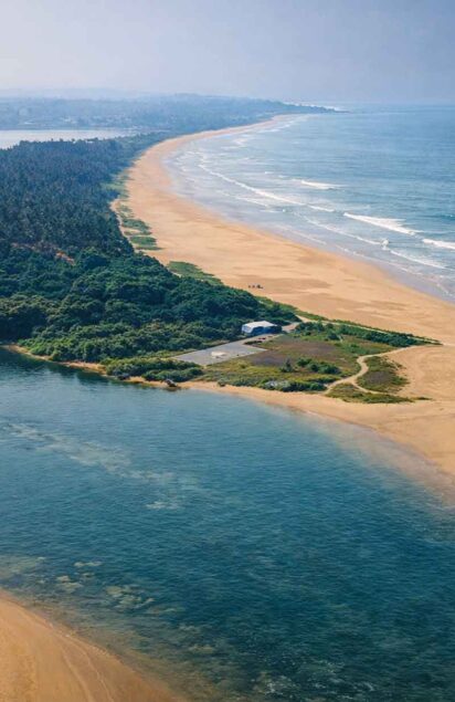 Here, the calm Bentota River flows gracefully into the Indian Ocean, creating a unique landscape of sea, lagoon, and lush greenery.